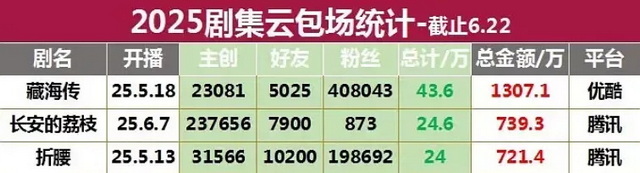 据豆瓣小组“收视率研究中心”统计的数据显示,截止6月22日,超高的云包场名单中不乏爆款的身影,比如,《藏海传》《折腰》《大奉打更人》《临江仙》。其中,《藏海传》的云包场投入1307.1万,成为首个千万级云包场剧集,粉丝奉献居多,而排在第二位的《长安的荔枝》,云包场投入739.3万,主创贡献居多。