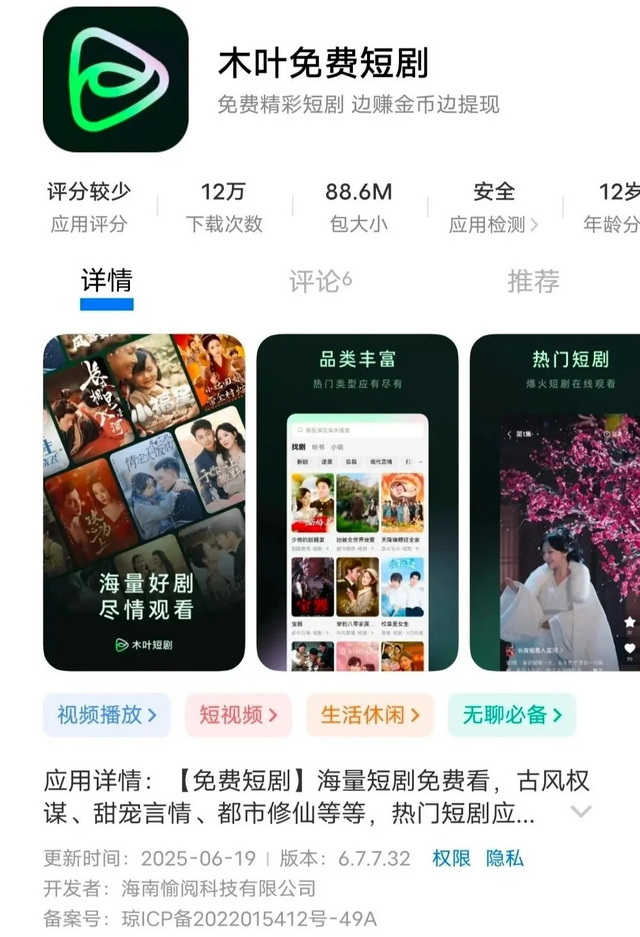 天眼查显示,该APP的开发者为“海南愉阅科技有限公司”,为北京笔墨留香科技有限公司的全资子公司,而北京笔墨留香科技有限公司正属于抖音集团即字节跳动之下。简言之,“木叶免费短剧”是字节跳动旗下的app。目前,该APP仅在vivo、小米等手机的应用商店上架,尚未在苹果App Store、三星、华为等应用商店上架。