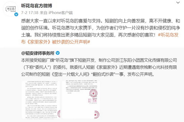 7月2日,短剧厂牌“听花岛”发布声明称,近期发现,南京烛影心光科技有限公司作品《歪出一片烟火人间》未经其授权,抄袭其版权作品《家里家外》并用于商业获利,此行为已严重侵犯了其合法权益。