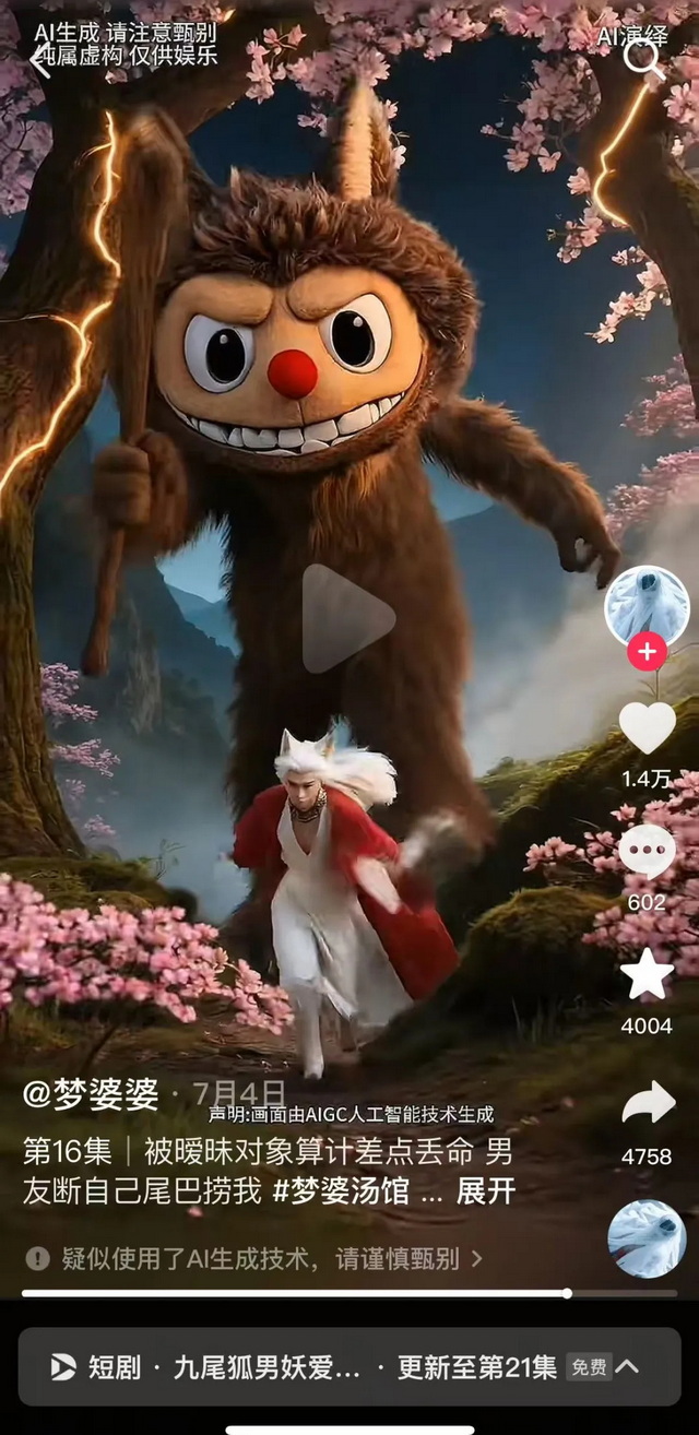 如果你最近在短视频刷到邪恶龙女炖鹿角汤、吃可爱小妖精,还放Labubu出来对付男主的奇葩视频,不要惊讶,AI短剧的确已经癫到超出认知了。