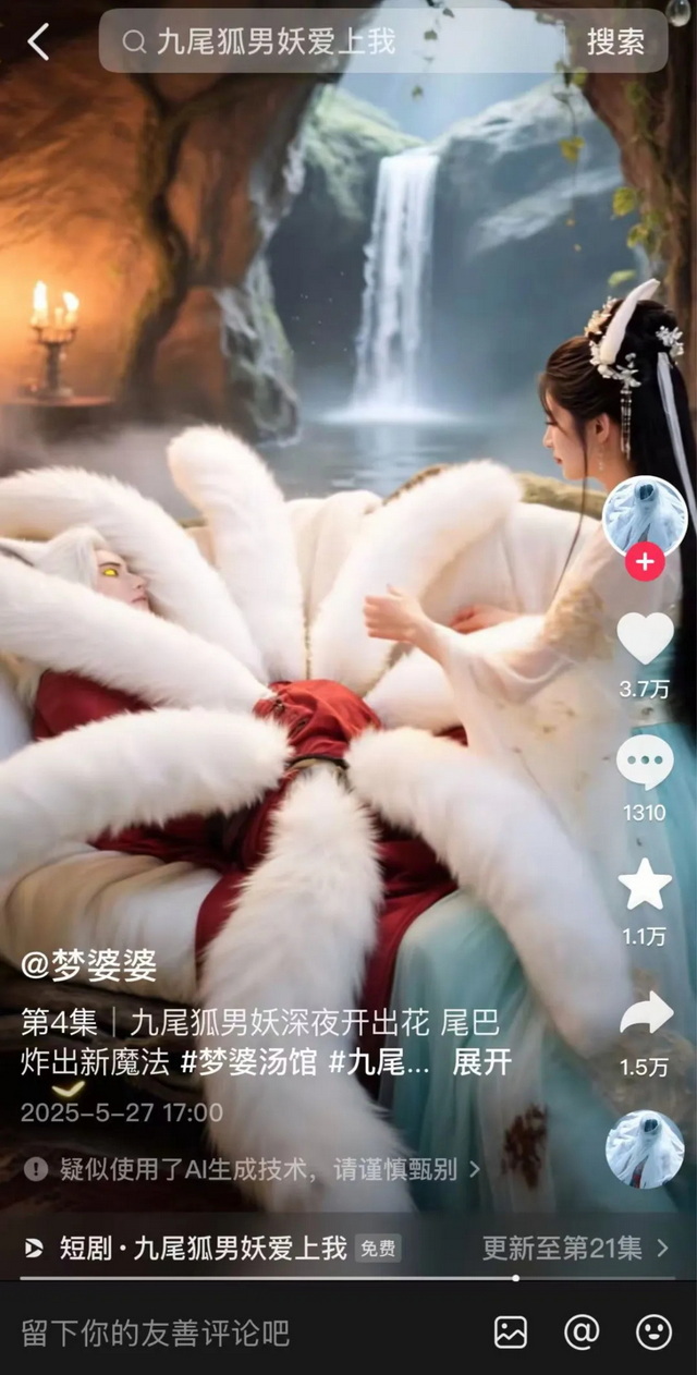 目前这部名为《九尾狐男妖爱上我》的AI短剧,目前更新至第21集,抖音播放量超1.2亿,进入抖音&快手在播短剧热度周榜前20名。