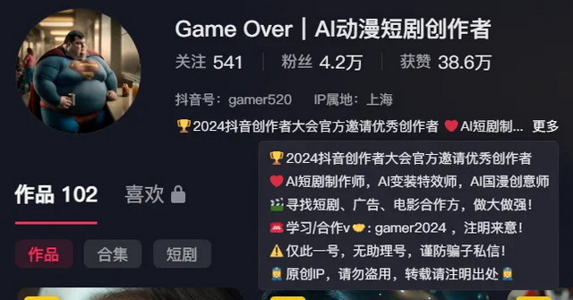 抖音AI博主主页(图源:抖音@Game Over丨AI动漫短剧创作者)