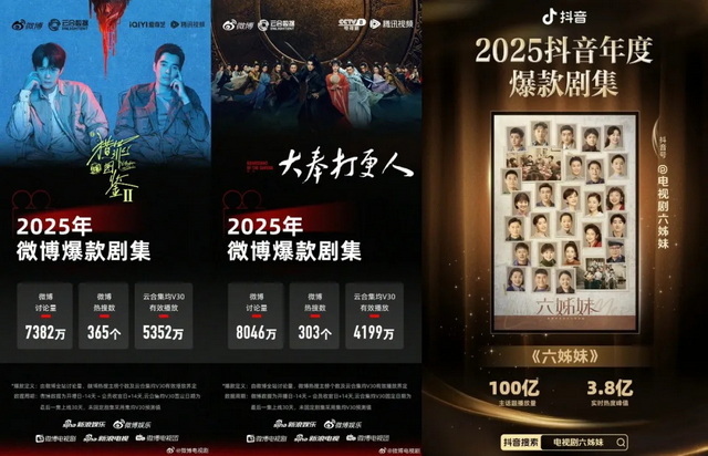在不同的社媒渠道,用户对于爆款的感知也有所不同,如《猎罪图鉴2》《大奉打更人》获得2025年微博爆款剧集认证,而《六姊妹》则是获得了2025抖音年度爆款剧集认证。这说明了在分众化的审美趋势下,头部平台的感知能力和制作能力,依然能有效覆盖多元需求。