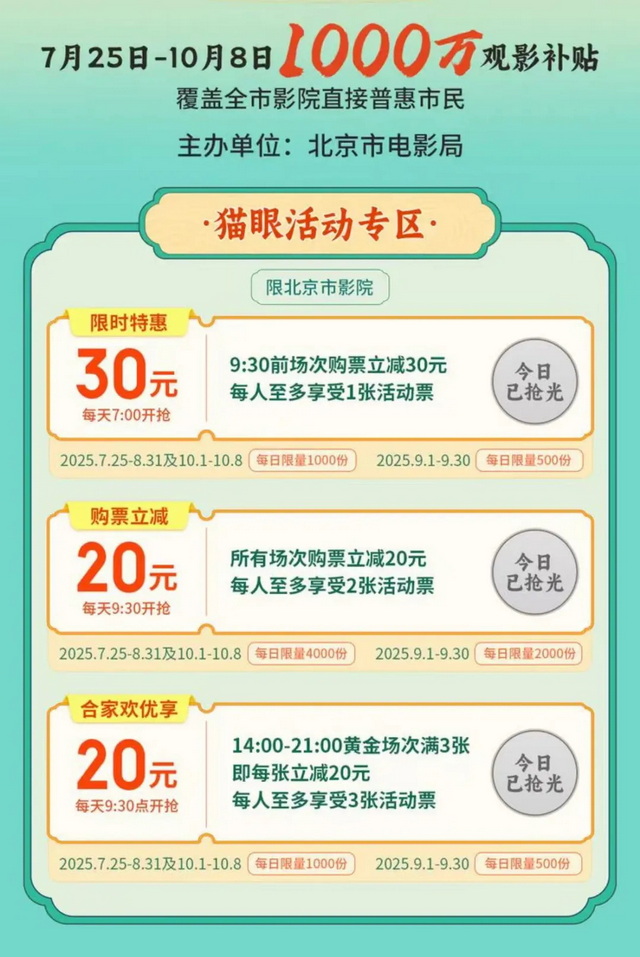 在总计1000万元的观影补贴中,北京市民可每日限量领取的优惠包括,购买北京市影院9:30前的电影场次时立减30元;购买所有影院所有影片所有场次,全日票价立减20元;针对14:00-21:00黄金场次,满3张即可享受每张立减20元;针对专门的影片,用户最低可19.9元观影,单票优惠力度达2-60元。政策已然在用尽可能低门槛的方式,帮助潜在观众缩短消费决策链条。