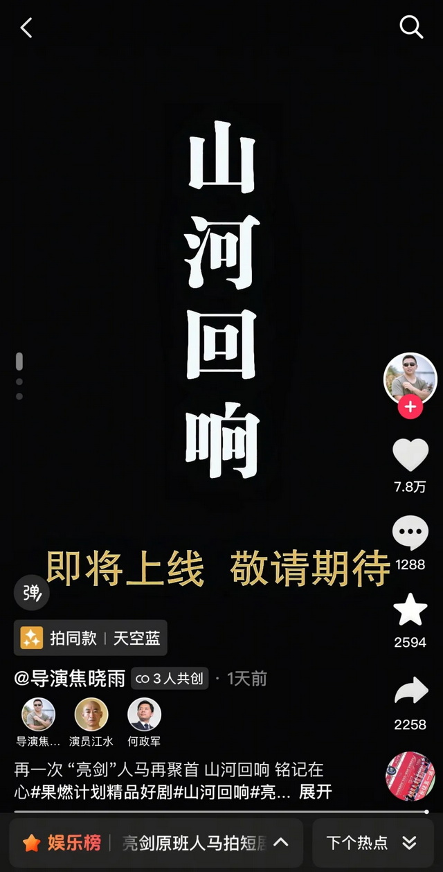 消息一出,#亮剑原班人马拍短剧 等相关话题,直接冲上抖音娱乐榜TOP1。