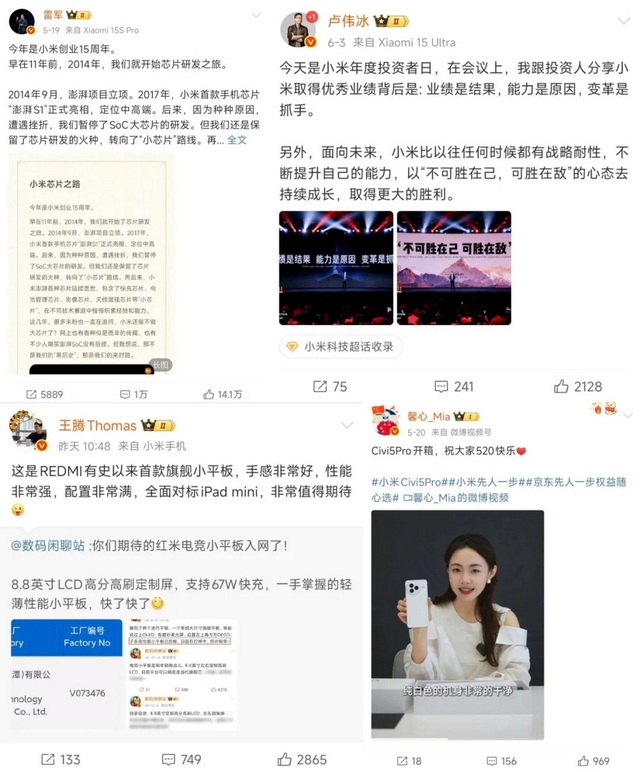 微博平台也成为了小米高管的社交矩阵地:雷军、卢伟冰等不同高管扮演着不同的角色,触达多维度的粉丝,传递品牌各角度的理念,共同构建了品牌丰富、立体的形象。