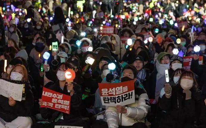 一个明显的现象变化在于,韩国民众的示威从之前的烛光抗议变成“集体性应援”,抗议者会拿着各种应援棒进行抗议,还会将热门的K-Pop歌曲改编为抗议歌曲。
