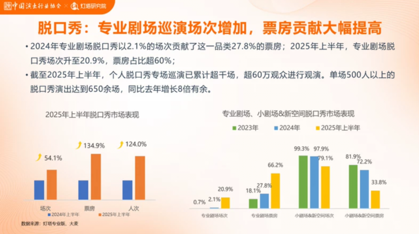 与此同时,脱口秀线下演出市场的发展情况也在向好,根据中国演出行业协会数据,2025年上半年,脱口秀票房同比增长了134.9%,成为剧场类演出中仅次于话剧的第二大品类。线下市场的繁荣,说明脱口秀已经具备独立的商业价值。